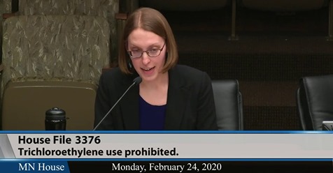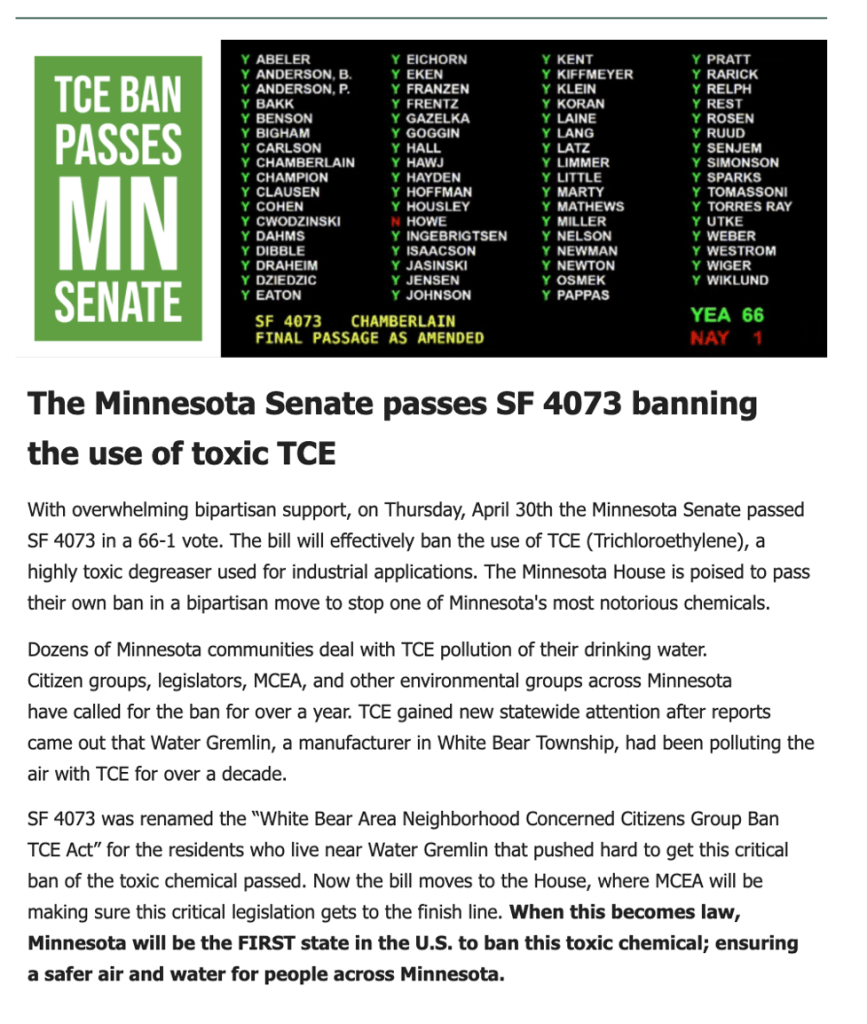 After passing through the Senate, 66 to 1, Representative Ami Wazlawik presented her bill to two committees and on May 14th, she presented it on the floor. The bill passed! The Governor is expected to sign the bill today, Saturday May 16th. With his signature, Minnesota will be THE FIRST STATE to ban TCE. Other states have pending legislation that they have not yet been able to push through. And, the EPA has TCE on a list of chemicals to phase out. Minnesota gets the ban done first and says YES to human health.