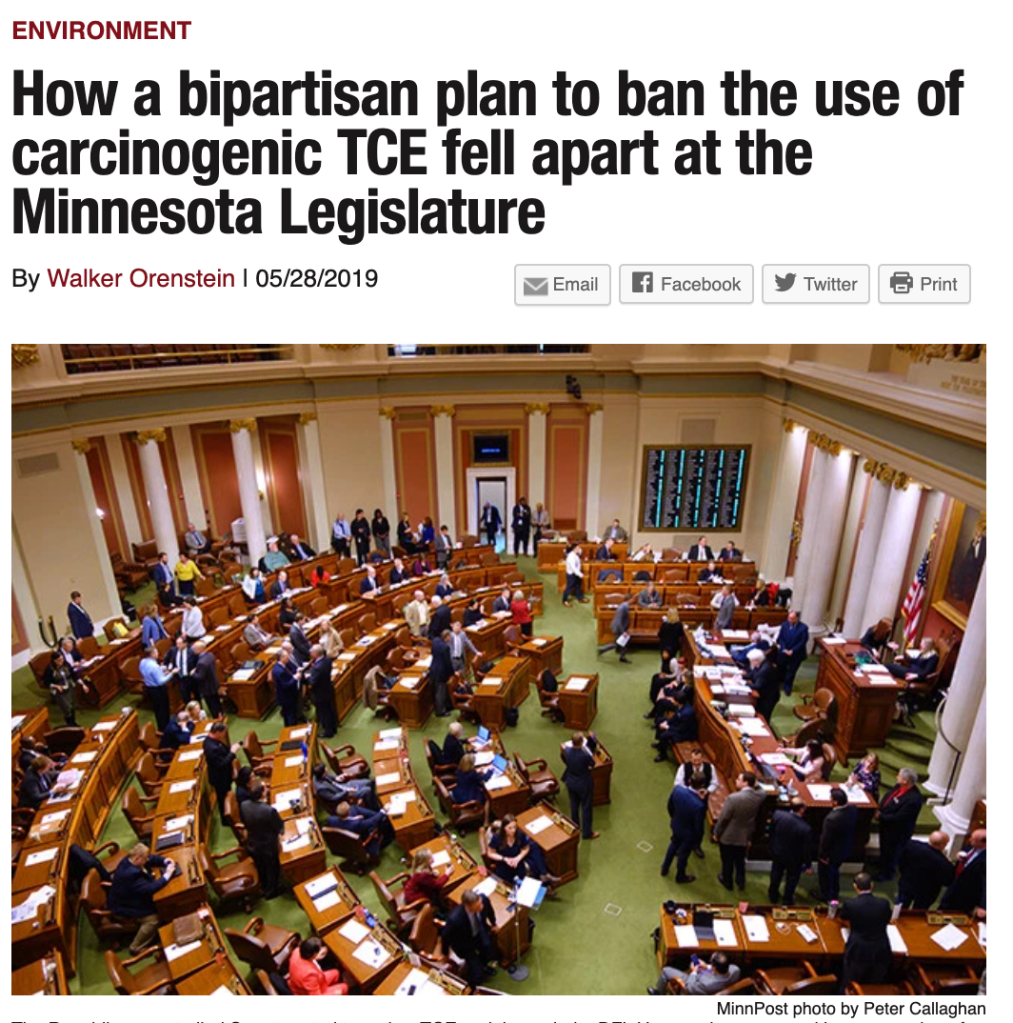 “….TCE has long been one of the most dangerous and widespread pollutants of air and water in Minnesota. Dozens of sites across the state have groundwater polluted by TCE, including cities like Fridley, New Brighton, Minneapolis, and St. Louis Park. TCE causes cancer at low levels of exposure. In 2016, the U.S. Environmental Protection Agency began the process to ban most uses of TCE, and proposed a rule to do so on the last day of the Obama administration. Under the Trump administration, rulemaking to ban TCE was dropped.”