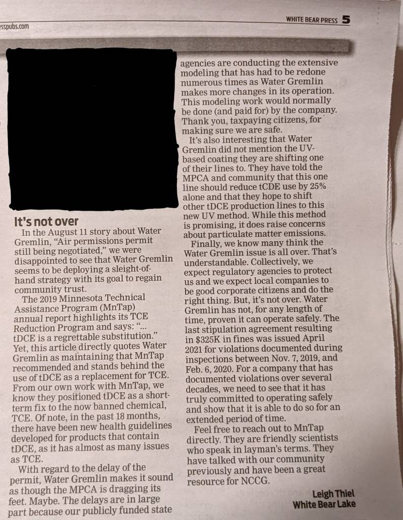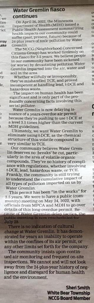 As we prepare for our comments on the new permit, we also know it’s highly likely that Water Gremlin is preparing to contest it. This letter to the editor, published in a July 2022 issue of the White Bear Press, anticipates what will be happening. And, it states very clearly the community resolve: “Our community believes Water Gremlin deserves no breaks be cut. …”